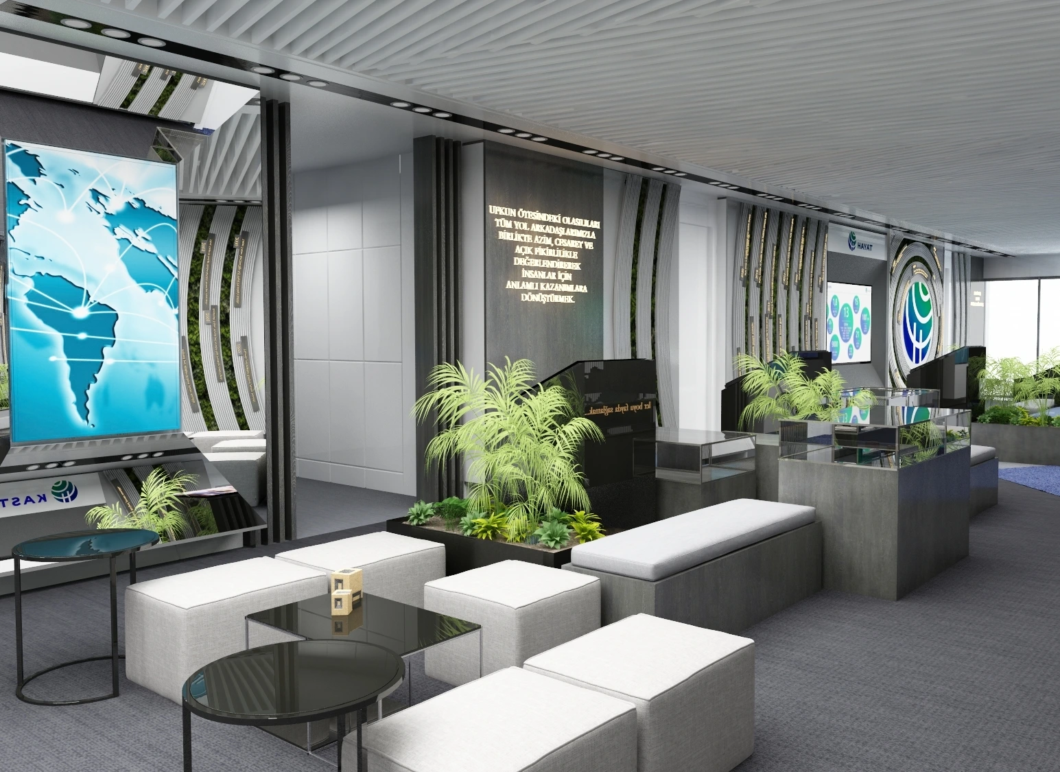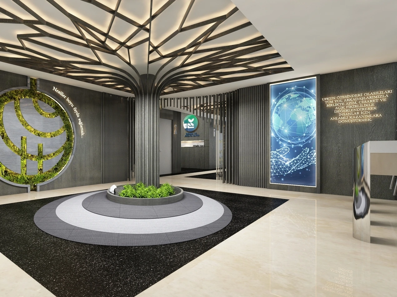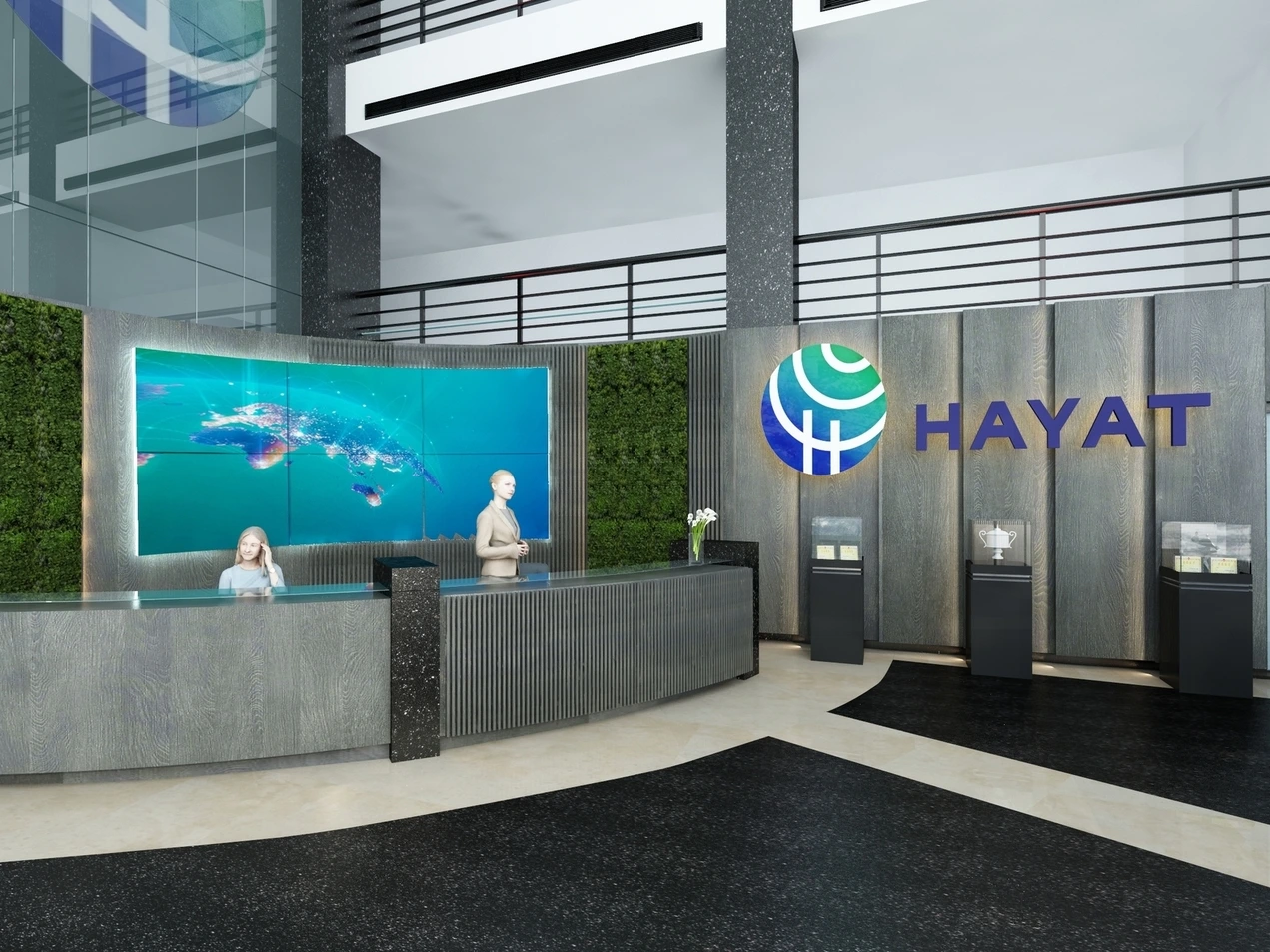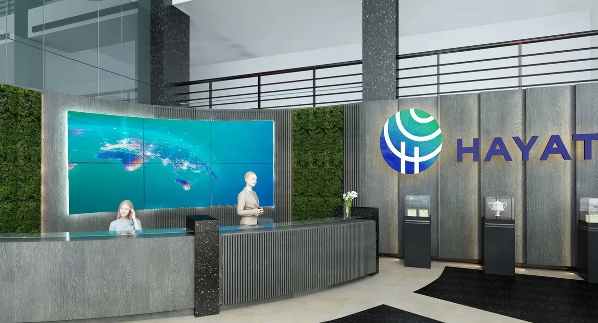 Bu görseller, Hayat Holding’in modern ve prestijli iç mekân tasarımını yansıtmaktadır. Şirketin köklü geçmişine gönderme yapan duvar panoları, yenilikçi aydınlatma çözümleri ve zarif detaylarla birlikte profesyonel ve küresel bir kimlik oluşturulmuştur. Doğal malzemelerle bütünleşen bu estetik yaklaşım, markanın sürdürülebilirlik ve inovasyon vizyonunu mekâna güçlü bir şekilde taşımayı hedeflemektedir. Tasarım dili, hem çalışanlar hem de ziyaretçiler için ilham verici, işlevsel ve kimlikli bir atmosfer sunar.